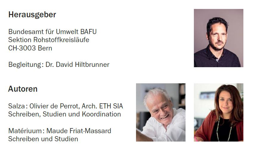 Beauftragt wurden Olivier de Perrot, Architekt ETH SIA, der Plattform SALZA, in Kollaboration mit Maude Friat-Massard von Matériuum. Um die Wiederverwendung im Schweizer Baubereich zu untersuchen wurde die Plattform RERIWI ins Leben gerufen.